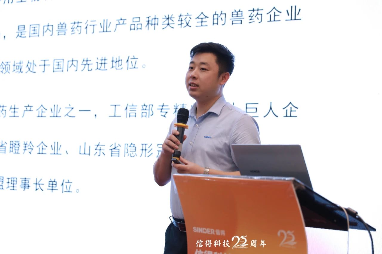 信得科技产品经理宋山亮在会议上提出针对夏季蛋鸡养殖的中药防控方案。面对高温高湿环境带来的挑战,该方案包括使用藿香正气口服液防暑抗应激,以及“肝净方案”强肝排毒,稳产高产。此外,宋山亮经理还介绍了双黄连口服液、麻杏石甘口服液和清瘟解毒口服液等中药产品在提升蛋鸡的健康水平和产蛋性能中的作用。