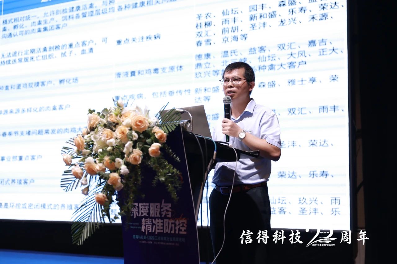信得科技技术服务总监杨天耀博士指出,信得科技致力于打造精准防控方案,通过持续健康体检、重点疾病监测、支原体综合防控等一体化模块,助力客户提升养殖效益。特别是针对禽流感、传染性支气管炎、传染性法氏囊病等重大疾病,信得科技已建立起庞大的监测防控体系,并通过深度服务项目和铁三角服务模式,确保疾病防控的及时性和有效性。