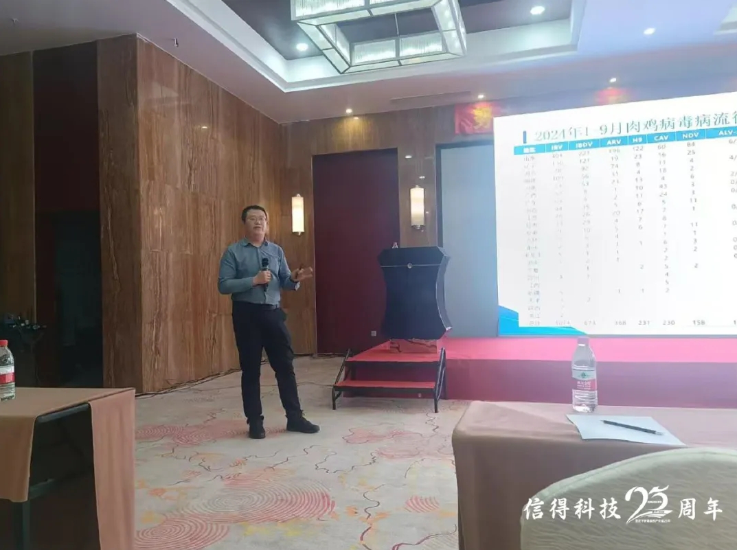 随后,北京信得威特科技有限公司副总经理田伟博士分享了信得科技2024年疾病流调情况。针对肉鸡常发的传支、流感、法氏囊等疾病,田博士提出了信得防控方案,分享了在流行疾病方面,信得疫苗和抗体研发的优势及现场应用实践。