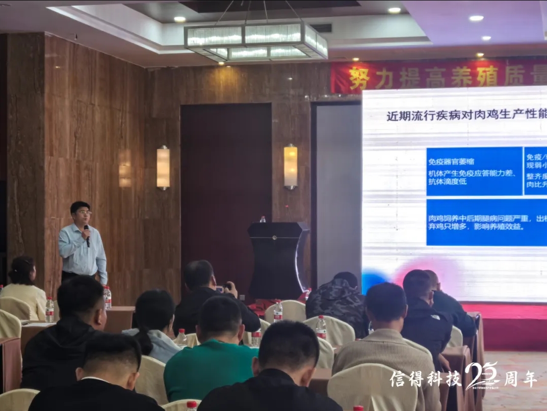 开云官方app下载站-开云(中国)产品技术经理栗斌针对近期流行的免疫抑制疾病对肉鸡的危害,提出转移因子信必妥程序化使用的防控方案,分享了信得与山东农大合作的转移因子实验室研究成果。会上,栗斌经理向与会嘉宾详细介绍了“信必妥治疗肉鸡腿病及缓解免疫抑制方面的案例”,为行业同仁提供了肉鸡免疫抑制疾病防控的新思路。