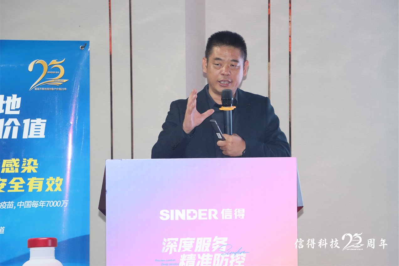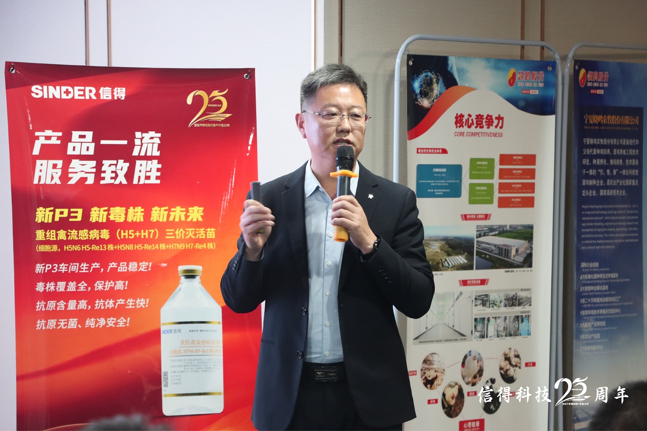 会上,信得科技市场管理部产品经理孟令旭向与会嘉宾详细介绍了信得科技公司成立二十五年来的发展情况,并重点介绍了“高致病性禽流感流调及监测数据”、“信得禽流感解决方案及产品特点”以及“信得细胞源禽流感疫苗价值点及使用案例”。孟经理表示,当前禽流感处于流行期,疾病防控需要从饲养管理、生物安全等方面共同开展,其中疫苗免疫是控制禽流感的有效方法,通过大量临床试验表明,信得禽流感疫苗具有毒株新、抗原高、应激小、易吸收的优点,可以为禽群提供有效保护!