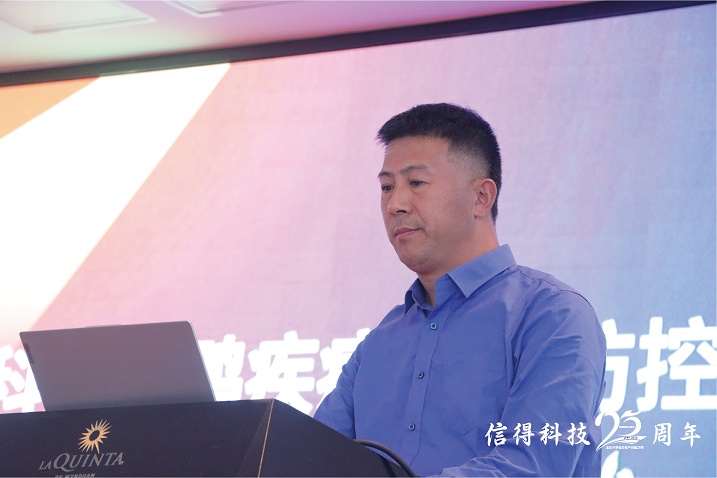 会上,临沂龙兴农牧公司技术总监董建光先生,结合临沂龙兴农牧在水禽养殖方面的成功案例和实战经验,为与会者提供了肉鸭“科学养殖 绿色养殖”的具体措施。董总表示,2019年沂南区域粗抗使用泛滥,为保障养殖户利益,确保食品安全,龙兴农牧与信得科技公司达成合作,顺利完成粗抗替代工作。2021年龙兴与信得在沂南共建实验室,针对放养业务进行疾病检测、疾病流调等工作,进一步落实科学养殖、精准防控。董总强调,龙兴与信得共建实验室提升了对疾病判断的准确性,对疾病精准防控,减少药品投入具有重要意义。