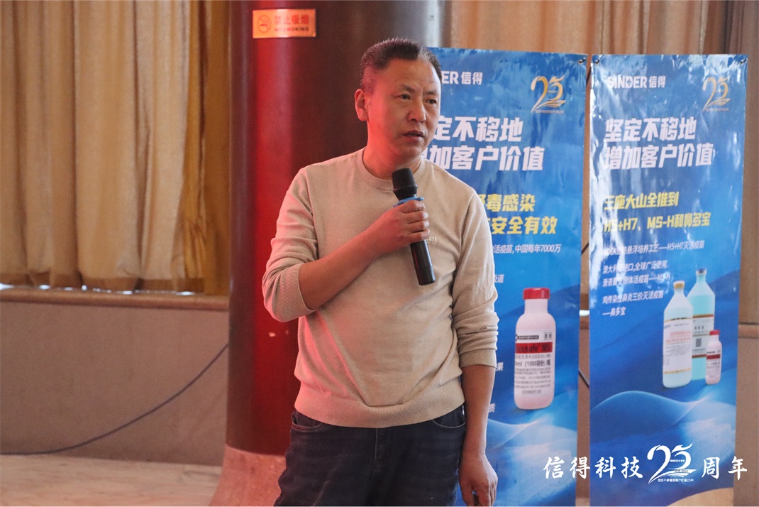 会上,信得科技副总裁闵祥平先生向与会嘉宾详细介绍了信得成立二十五年来的发展情况,闵总表示,信得成立以来一直专注于动保业务,已发展为产品线齐全处于市场头部的高科技企业。目前,在山东、北京、四川建有六个生产基地,三十九条生产线全部通过新版兽药GMP验收。闵总强调,信得始终立足“坚定不移地增加客户价值”的原则,支持客户精准防控、提升养殖效益和质量。