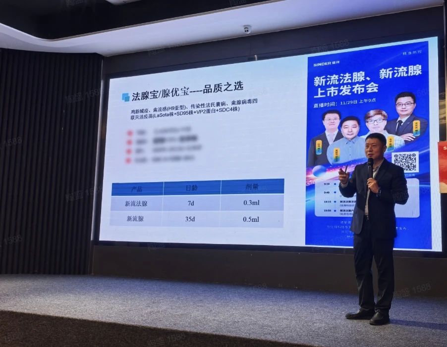 春季气温回升,禽流感疾病频发,其变异速度快、传播力强,将给养殖企业带来严重经济损失,同时,一种新型鸭疫病毒在蛋鸡上逐渐流行。为支持行业同仁有效预防禽流感和鸡源鸭疫,提升养殖效益。会上,信得科技产品经理孟令旭以《蛋鸡春季禽流感及鸡源鸭疫防控方案》为主题汇报了当前禽流感和鸡源鸭疫的流行情况,并结合实际案例,提出一系列科学有效的防控策略。孟经理表示,高致病性禽流感会导致蛋鸡多种脏器出血性败血症变化、卵泡液化、大幅降蛋等问题,影响养殖健康,建议大家通过持续流调,了解当地毒株变化情况,及时监测抗体水平,适时加强免疫。孟经理指出,信得细胞悬浮禽流感疫苗,应激小、保护高,吸收好、抗体稳定、产蛋期使用降蛋极少,能有效降低禽流感的发生。对于新流行的鸡源鸭疫,孟经理建议大家在降低各种应激因素,提高鸡群免疫力的基础上,对于高风险区域,疫苗能免就免,同时,也有噬菌体和筛选高敏抗生素供大家在治疗时选择使用。