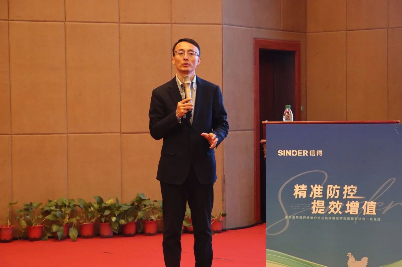 产品技术经理石子虎在辽宁的春防会议上向蛋鸡同仁分享了《当前鸡源鸭疫的防控方案》,他指出,鸡源鸭疫作为一种新发疾病,近年来在蛋鸡群体中呈现逐渐流行的趋势,多与禽流感H9、传支、传贫、传鼻等疾病混感,给养殖行业带来了新的挑战。信得科技种商一体化、全方位防控策略,从种鸡净化、药品治疗、生物安全、增免、养殖管理、检测、疫苗免疫等方面为客户提供系统支持,可有效防控鸡源鸭疫,为客户提供确定性价值。会上,石经理还重点介绍了鸡源鸭疫防控的四道防线及方案,提出了“生物安全+信必妥(香菇多糖)+疫苗”的预防方案;和“信必妥(香菇多糖)+噬菌体+抗生素+ 疫苗(不反复)”的治疗方案。