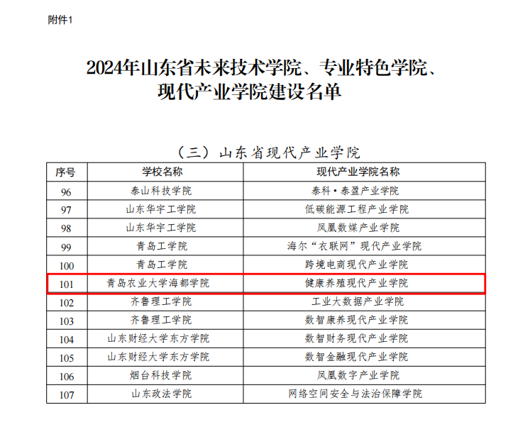 近日,山东省教育厅《关于公布2024年山东省特色学院和拔尖创新人才培养组织实施高校名单的通知》(鲁教高函〔2025〕8号)发布,经省教育厅、工业和信息化厅等部门联合评审,青岛农业大学海都学院申报的健康养殖现代产业学院成功获批山东省高校省级现代产业学院,成为青岛农大海都学院首个省级现代产业学院。