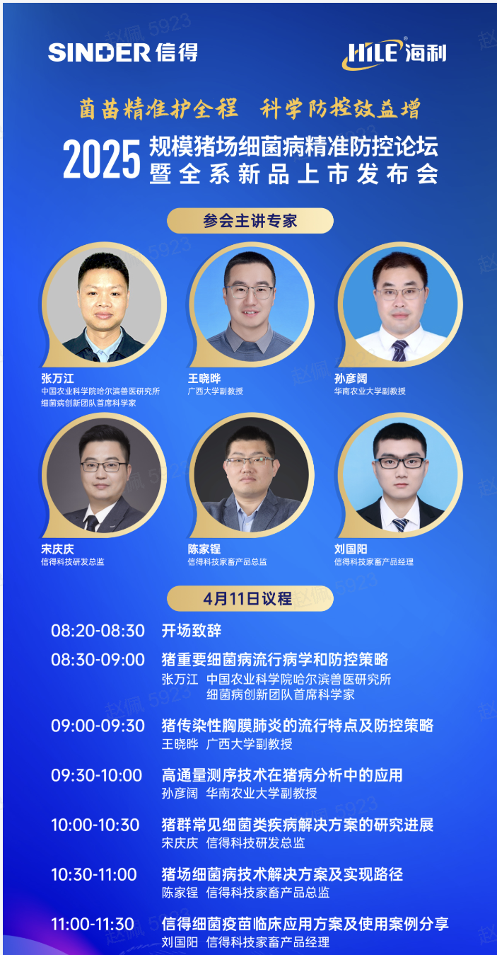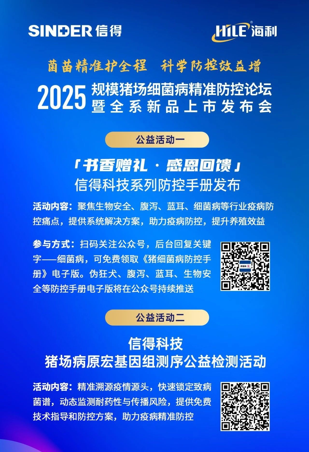 2025年4月11日,信得科技“规模猪场细菌病精准防控论坛暨全系新品上市发布会”成功召开。本次会议以“菌苗精准护全程,科学防控效益增”为主题,聚焦当前挤压养殖利润的“隐形杀手”——细菌病,面对养殖行业所面临的耐药性加剧、混合感染频发、抗生素依赖成本攀升等痛点,信得科技邀请中国农业科学院哈尔滨兽医研究所细菌病创新团队首席科学家张万江、广西大学副教授王晓晔、华南农业大学副教授孙彦阔等权威专家,以及信得科技研发及产品技术服务团队,共同探讨从“被动治疗”向“主动防御”转型的技术路径与战略方向。会议采用线上形式召开,在信得科技、新猪派、新猪网三大媒体平台全程同步直播。