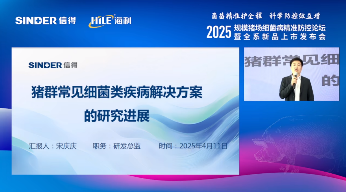 宋庆庆博士在报告中详细介绍了信得科技公司及其研发中心近年来的发展情况。宋博士指出,信得科技通过强大的研发实力和科研院所的紧密合作,可为猪群常见细菌病提供精准防控方案,涵盖从病原分离、疫苗研发到智能制造的全流程,为养殖企业提供高效、安全的解决方案。