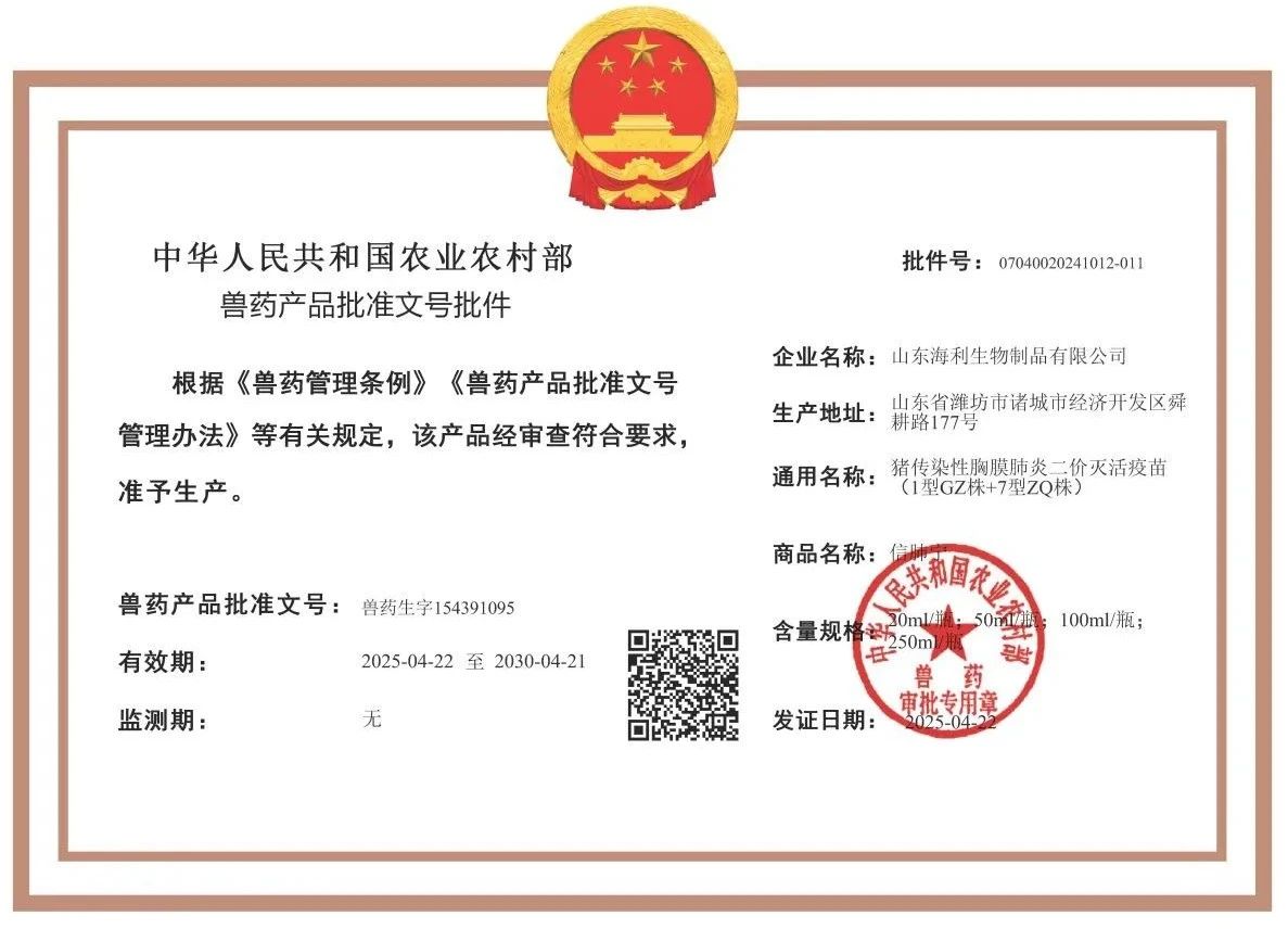 近日,信得科技获得猪传染性胸膜肺炎二价灭活疫苗、猪链球菌病灭活疫苗 2 个兽药产品批准文号。