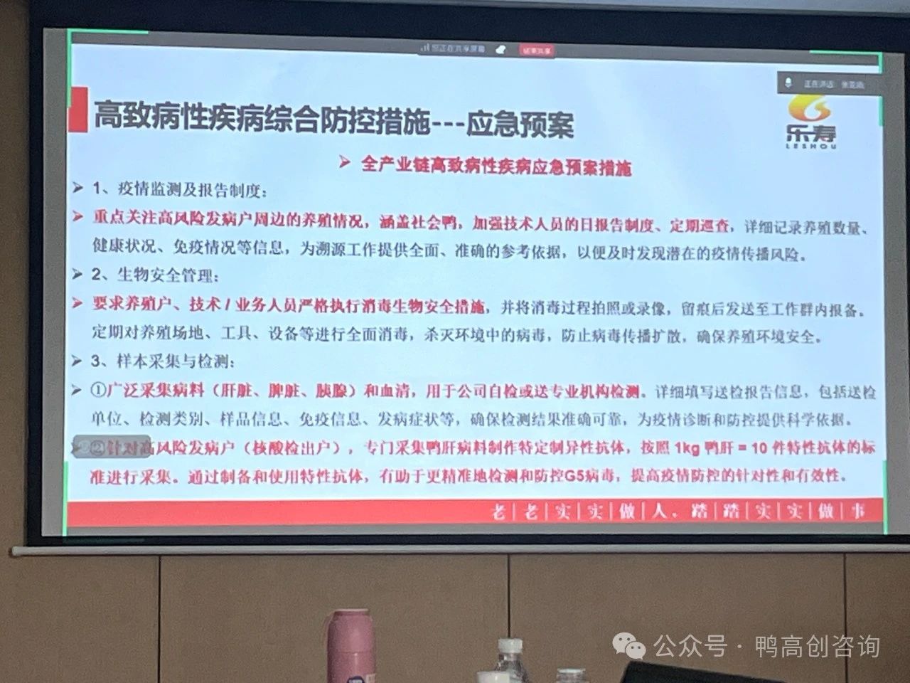乐寿动保实验室主任胡海峰分享了他们春节疾病防控的经验,从去年鸭高创内部召开疾病联防联控会议后,乐寿一直执行严格的免疫和生物安全措施。因此,沧州周边养殖户发病后,乐寿发病和死淘较少,疾病防控效果良好。同时发现,如果鸭苗质量较差,混合感染呼肠孤病毒后,流感等疾病的发生率将提高。疾病防控没有局外人,需要大家攻克时艰,决胜防疫之站。