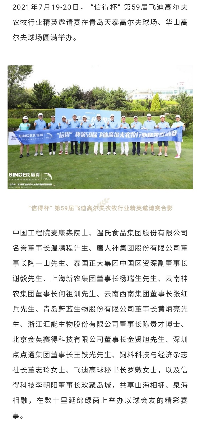 2021年7月19-20日, “信得杯” 第59届飞迪高尔夫农牧行业精英邀请赛在青岛天泰高尔夫球场、华山高尔夫球场圆满举办。