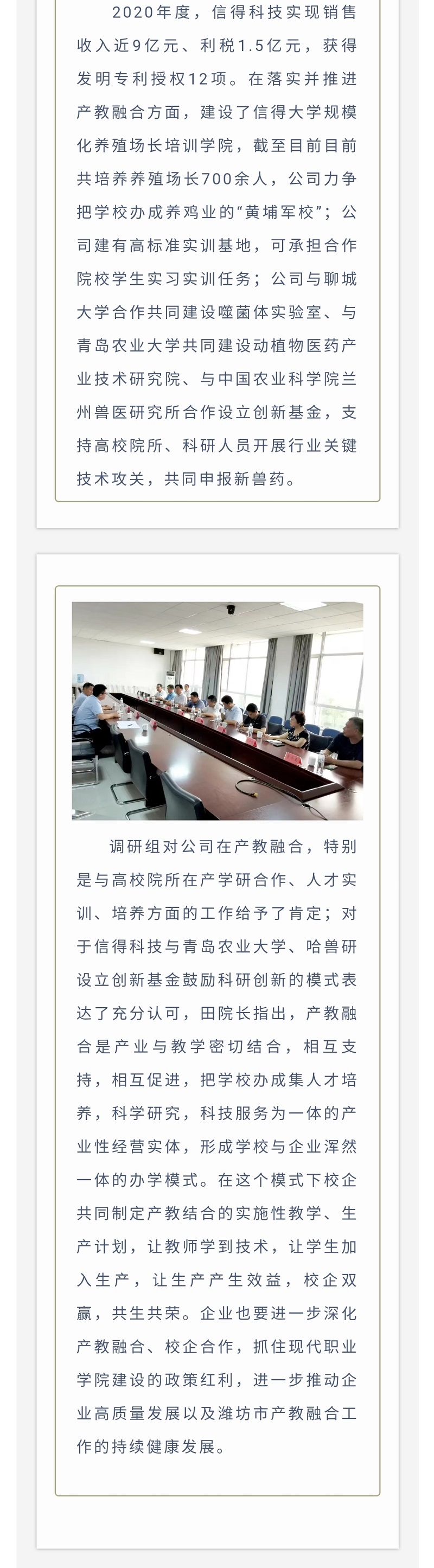 8月12日下午,潍坊市产教融合研究院执行院长田元训、潍坊市工信局培训与交流科科长李培宝、潍坊市产教融合研究院副院长冯秀红一行到访信得科技,调研公司产教融合组织实施情况。