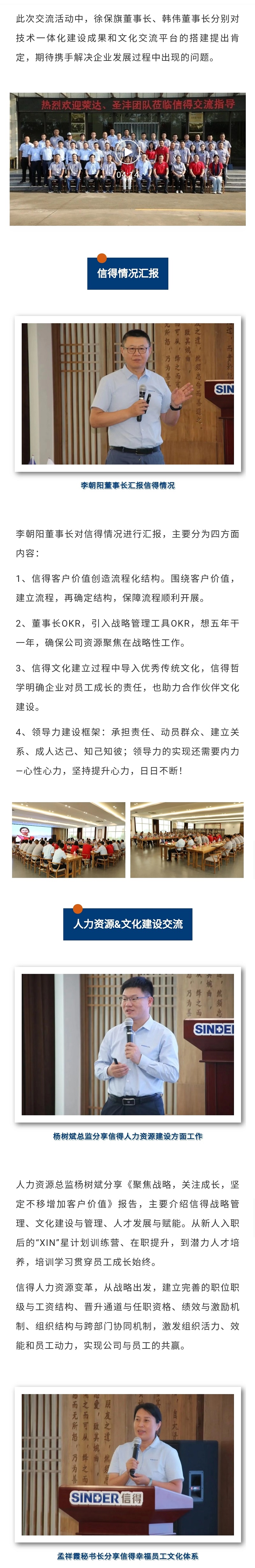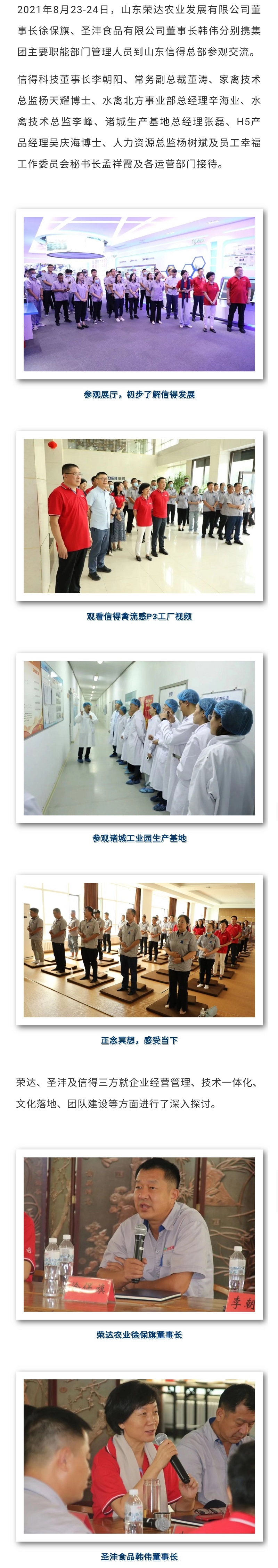2021年8月23-24日,山东荣达农业发展有限公司董事长徐保旗、圣沣食品有限公司董事长韩伟分别携集团主要职能部门管理人员到山东信得总部参观交流。